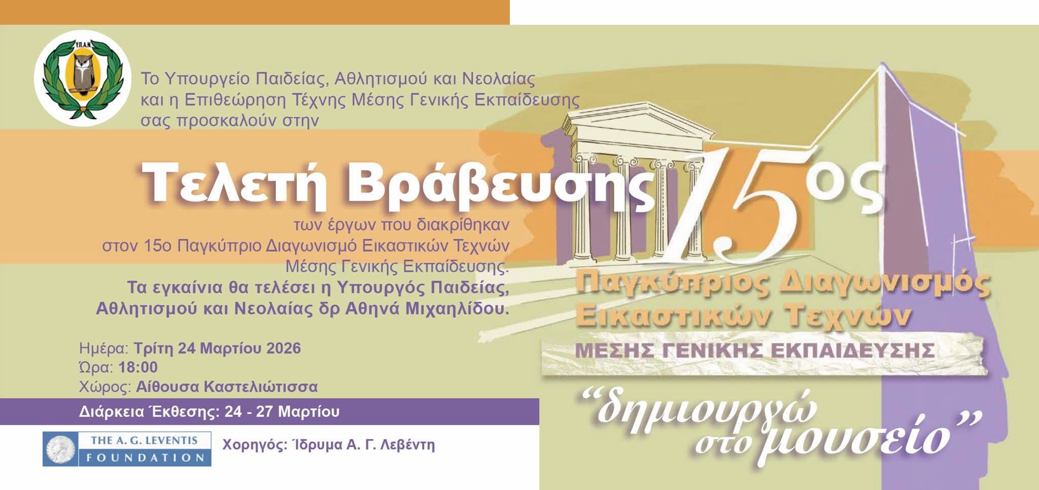 Τελετή βράβευσης των έργων που διακρίθηκαν στον 15ο Παγκύπριο Διαγωνισμό Εικαστικών Τεχνών Μέσης Γενικής Εκπαίδευσης, στην Αίθουσα Καστελιώτισσα στη Λευκωσια.