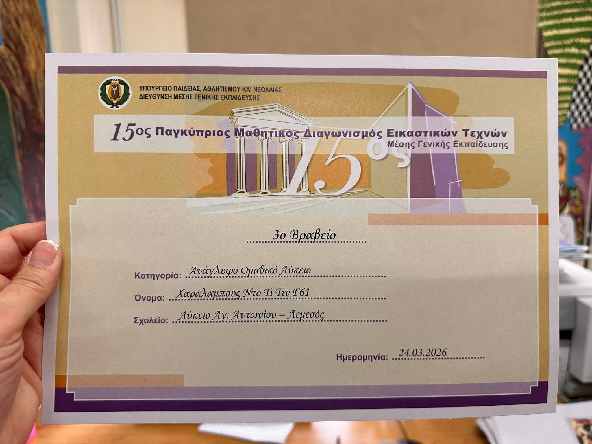 3ο Βραβείο στην κατηγορία Ομαδικό Ανάγλυφο Λυκείου.