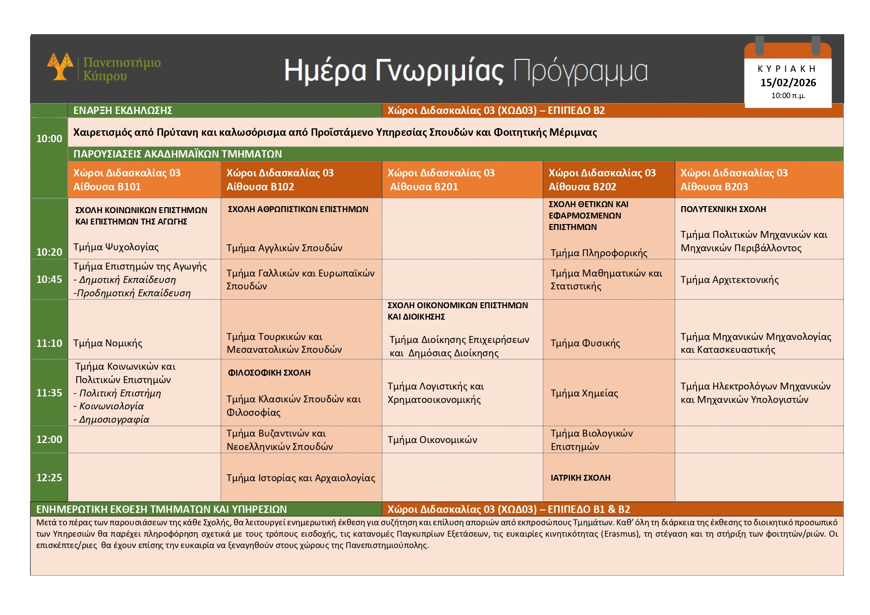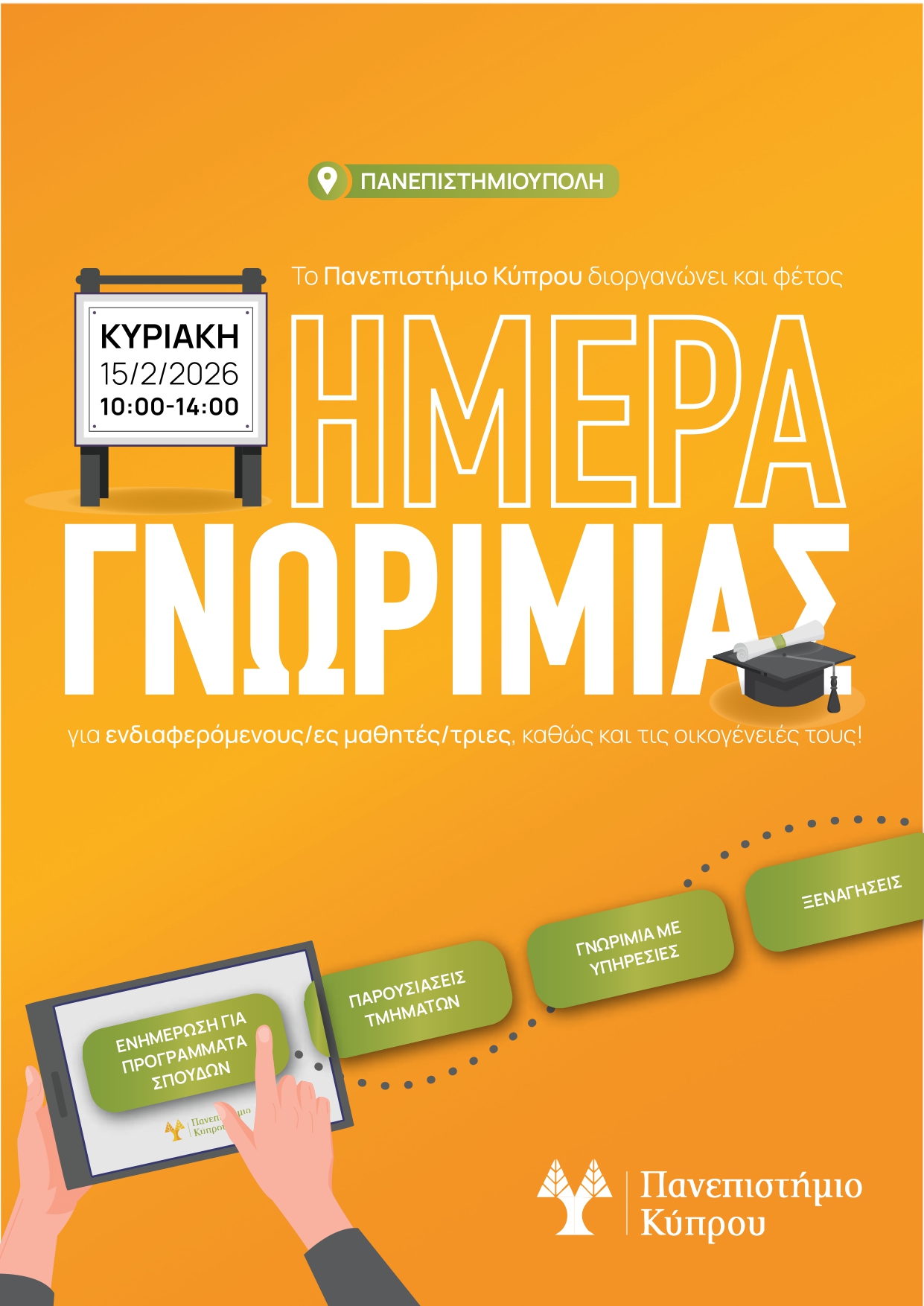 Η Υπηρεσία Σπουδών και Φοιτητικής Μέριμνας του Πανεπιστημίου Κύπρου, στο πλαίσιο ενημέρωσης των υποψήφιων προπτυχιακών φοιτητών/τριών για τα προγράμματα σπουδών και τις παρεχόμενες υπηρεσίες προς τη φοιτητική κοινότητα, διοργανώνει «Ημέρα Γνωριμίας» (Open Day), την Κυριακή 15 Φεβρουαρίου 2026, και ώρα 10.00 -14.00, στην Πανεπιστημιούπολη. Η εκδήλωση είναι ανοιχτή για το κοινό.