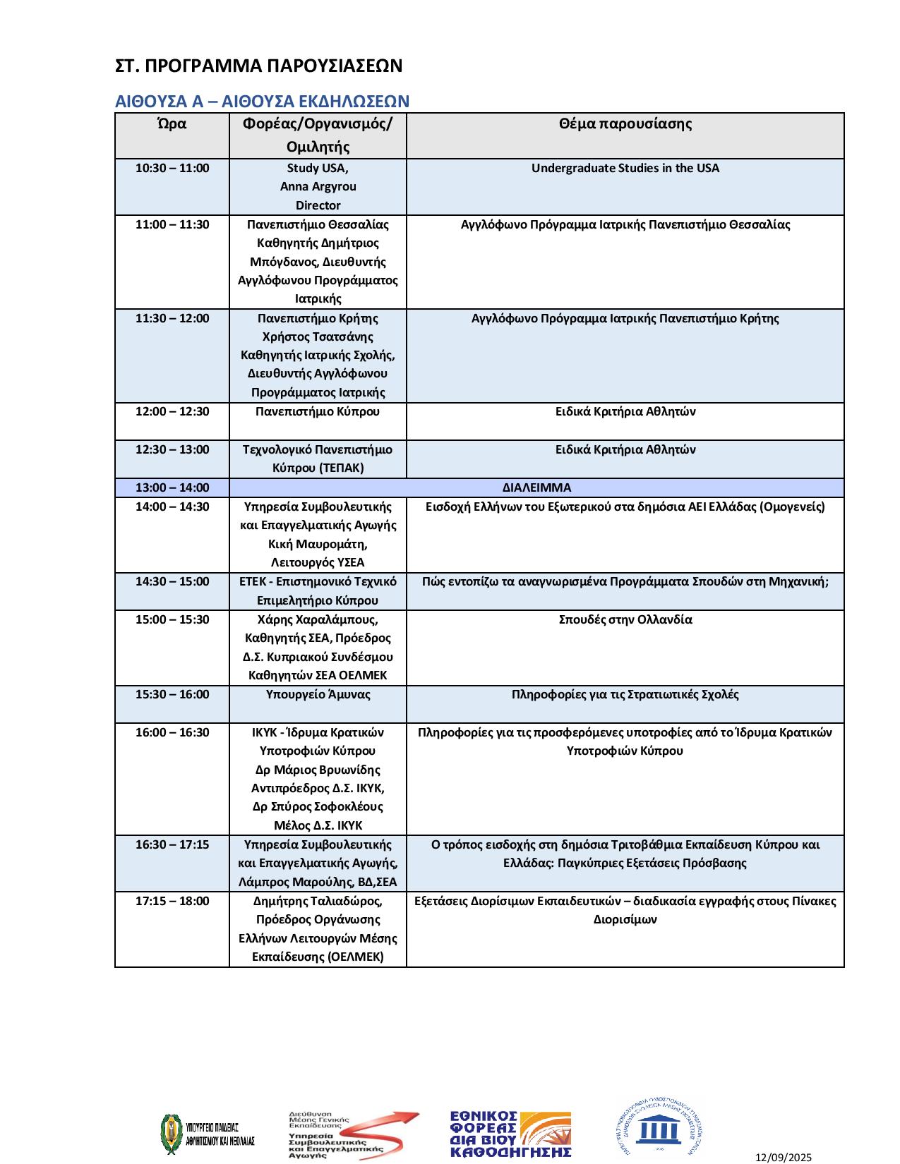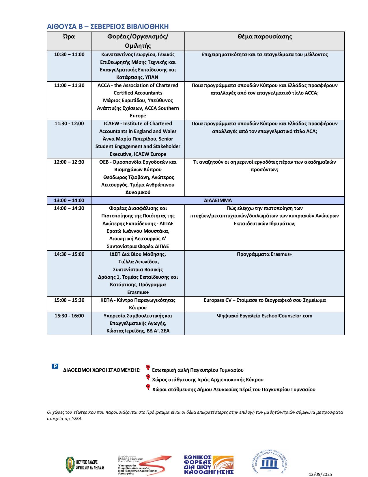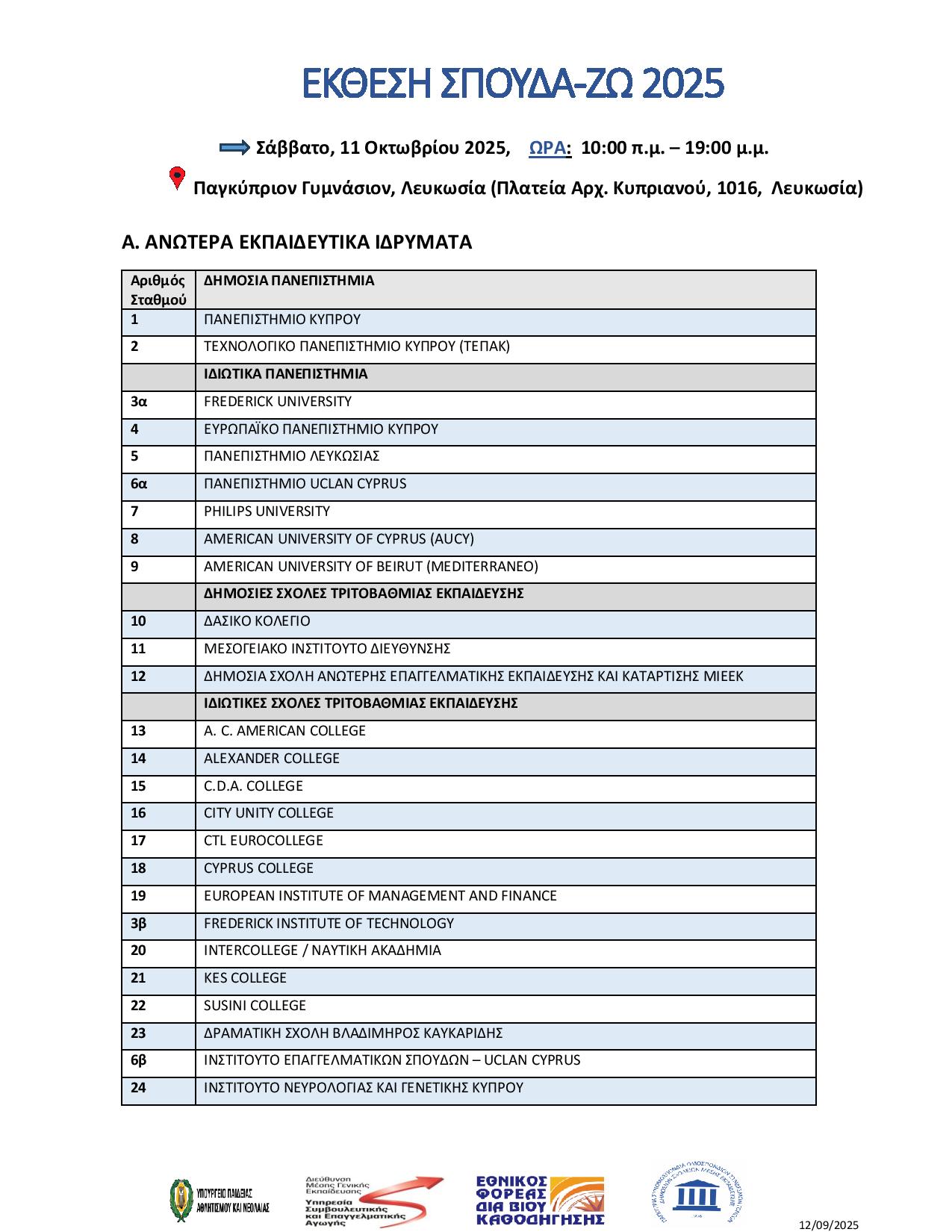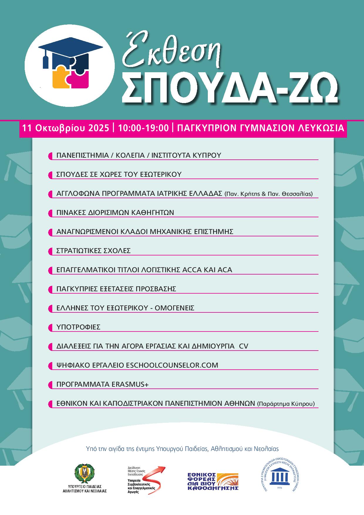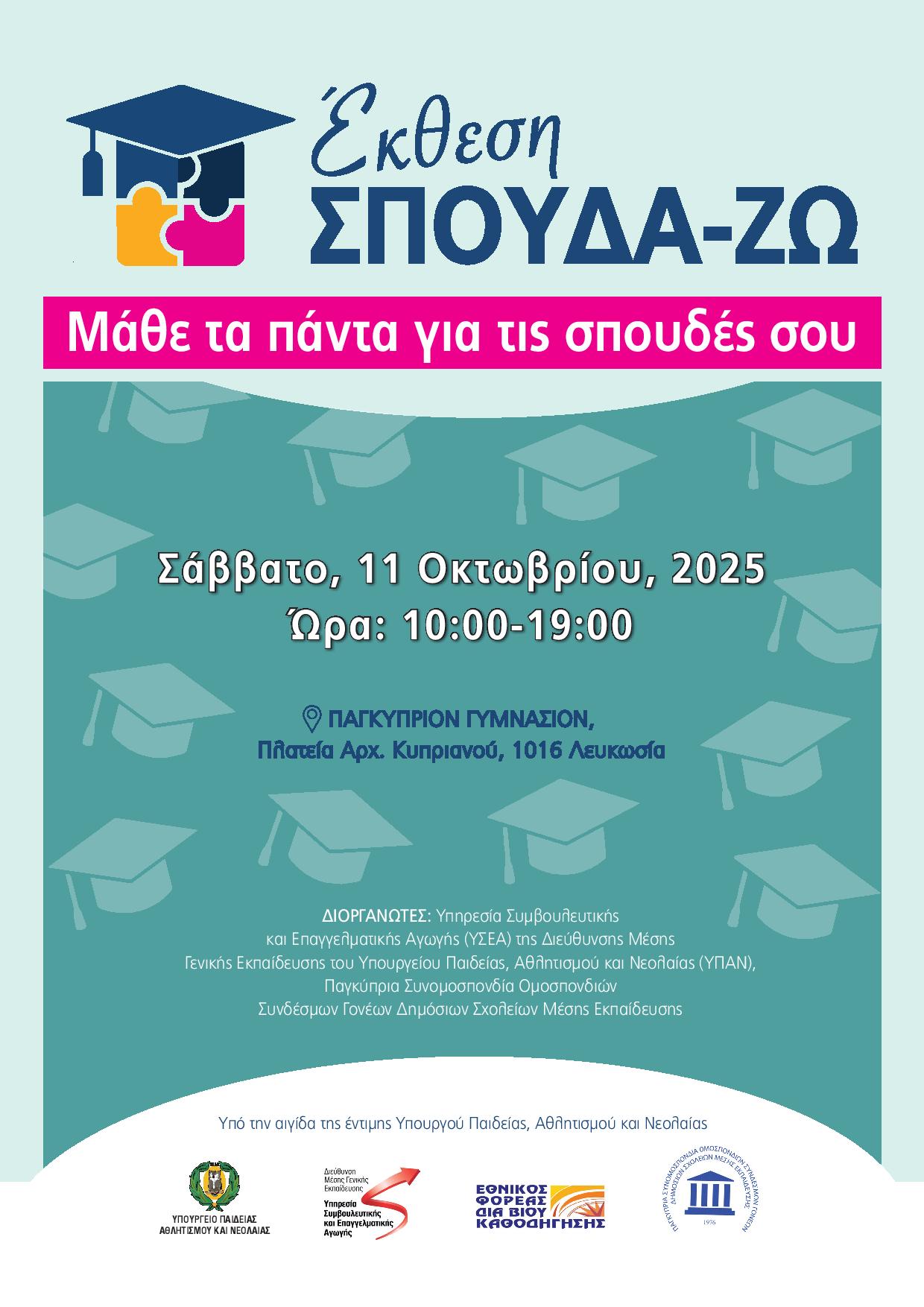 Η Υπηρεσία Συμβουλευτικής και Επαγγελματικής Αγωγής (ΥΣΕΑ) σε συνεργασία με την Παγκύπρια Συνομοσπονδία Ομοσπονδιών Συνδέσμων Γονέων Δημοσίων Σχολείων Μέσης Εκπαίδευσης διοργανώνουμε και φέτος την Έκθεση «ΣΠΟΥΔΑ-ΖΩ 2025»