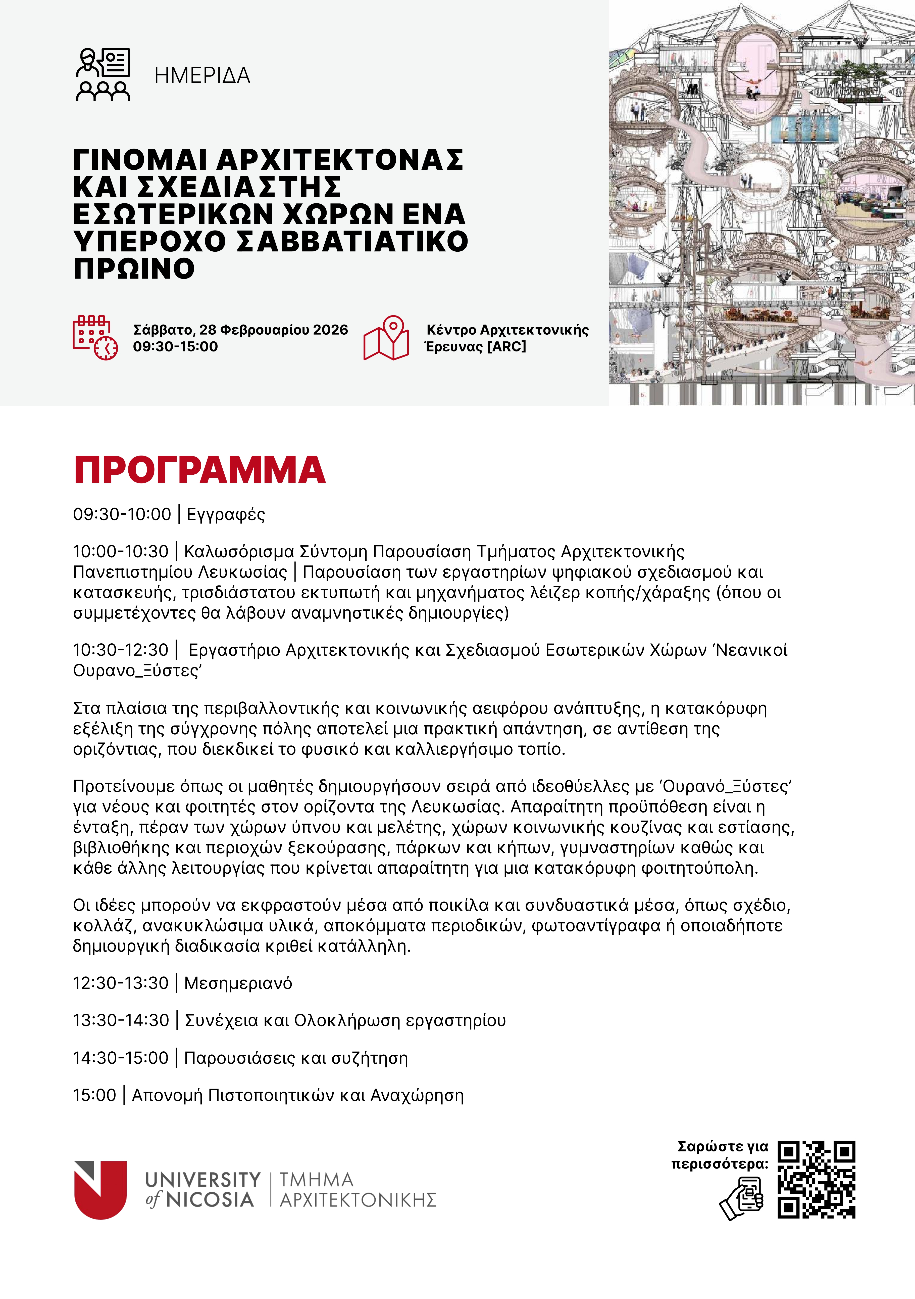 Η συγκεκριμένη Ημερίδα θα πραγματοποιηθεί το Σάββατο, 28 Φεβρουαρίου 2026 από 09:30 – 15:00 στο Κέντρο Αρχιτεκτονικής Ερευνάς (ARC).