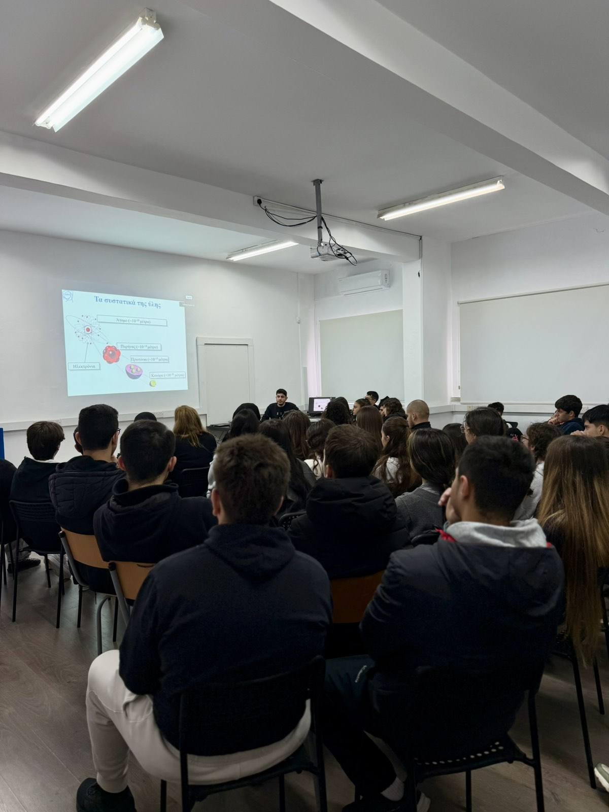 Σήμερα, από τις 08:30 μέχρι τις 09:30, τα τμήματα ΑΕ1, Α21, Β31 και Γ32 του Λυκείου Αγίου Αντωνίου δεν παρακολούθησαν απλώς ένα μάθημα Φυσικής, αλλά βίωσαν ένα νοητό ταξίδι στα βάθη της γνώσης, στις υπόγειες εγκαταστάσεις του πειράματος ATLAS, στον επιταχυντή LHC του CERN εκεί όπου η ανθρωπότητα προσπαθεί να κατανοήσει τα μυστικά της ίδιας της ύπαρξής της.