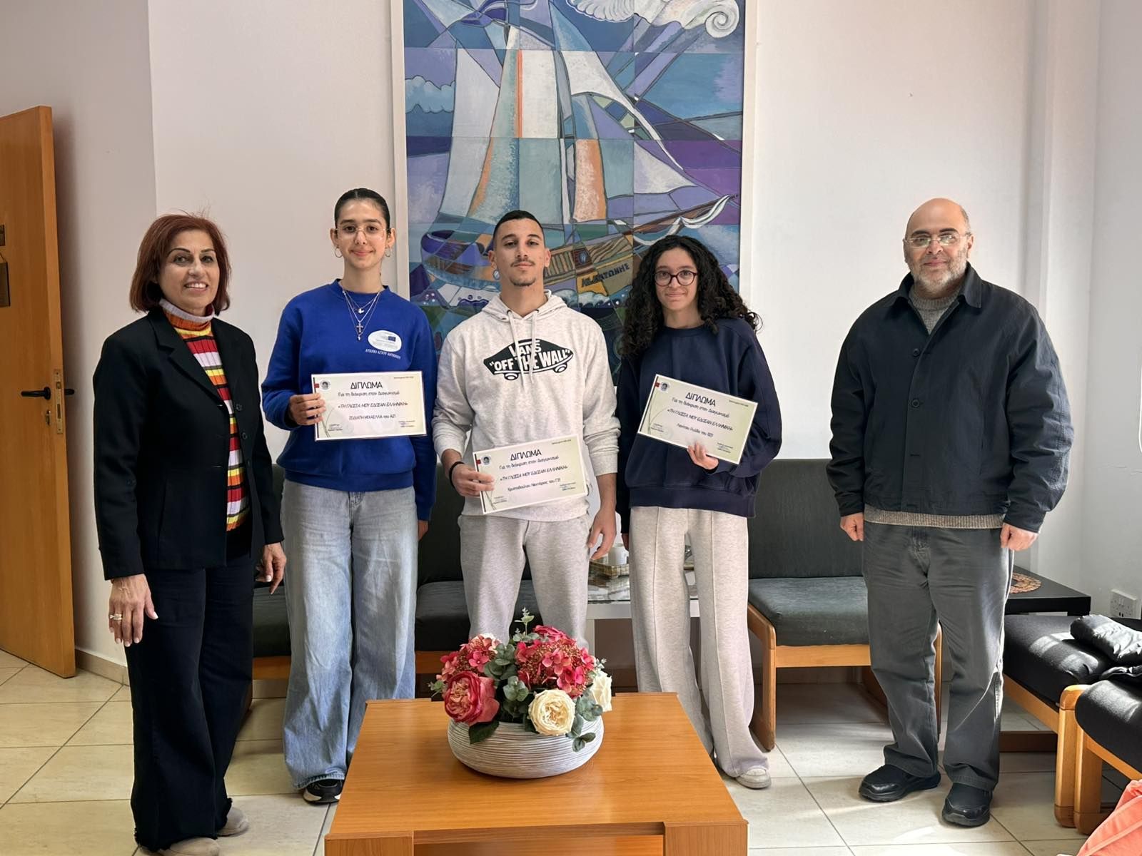 Οι τρεις επικρατέστεροι, μαθητής / μαθήτριες του Σχολείου μας κατά την ενδοσχολική Φάση του Διαγωνισμού «Τη Γλώσσα μού έδωσαν Ελληνική», οι οποίοι θα εκπροσωπήσουν το Σχολείο μας στη Β΄ Φάση του Διαγωνισμού που θα γίνει σε επαρχιακό επίπεδο εντός του μήνα.