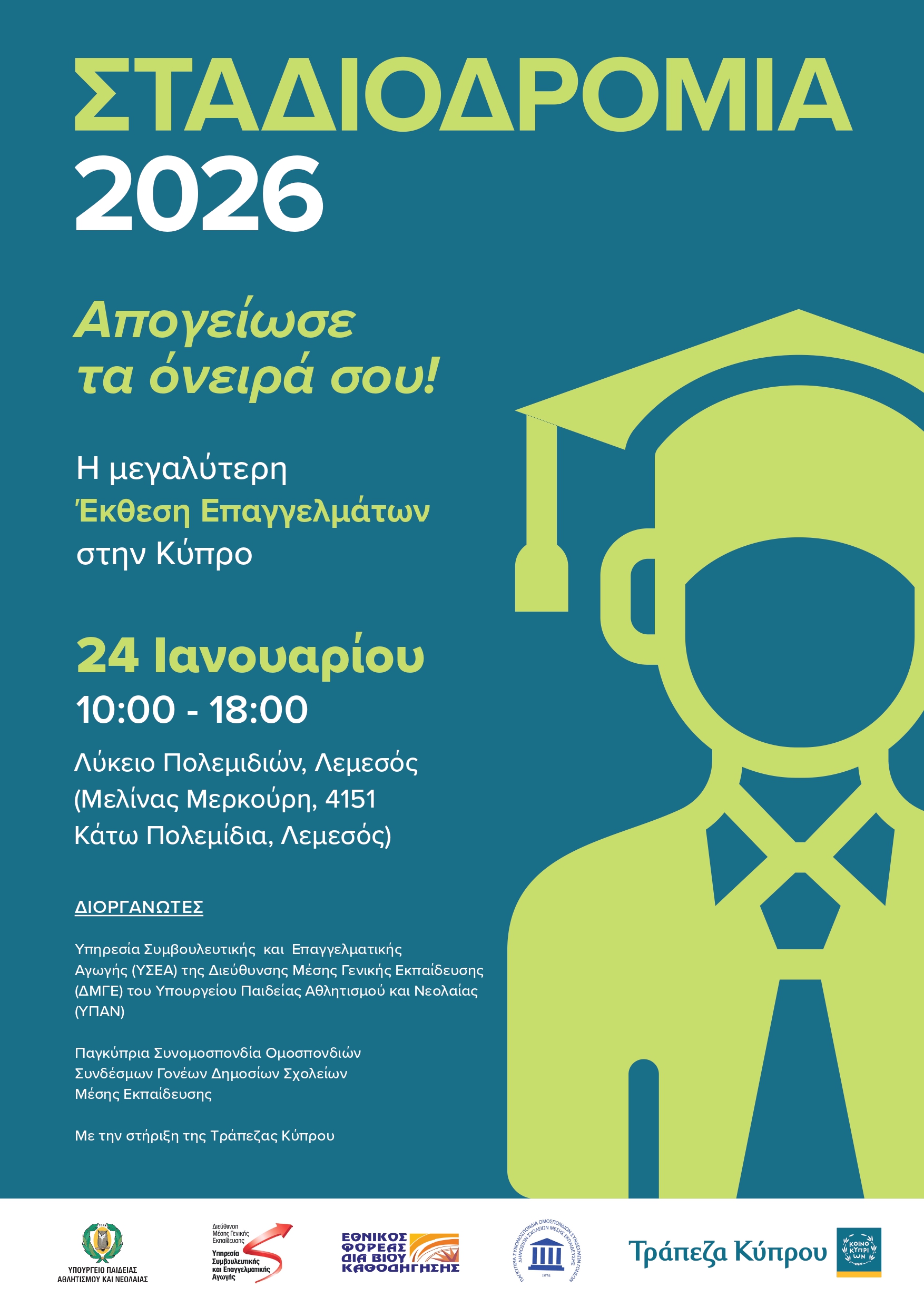 Αναφορικά με το πιο πάνω θέμα, σας ενημερώνουμε ότι η Υπηρεσία Συμβουλευτικής και Επαγγελματικής Αγωγής (Υ.Σ.Ε.Α.) της Διεύθυνσης Μέσης Γενικής Εκπαίδευσης, σε συνεργασία με την Παγκύπρια Συνομοσπονδία Ομοσπονδιών Συνδέσμων Γονέων Δημοσίων Σχολείων Μέσης Εκπαίδευσης και με τη στήριξη της Τράπεζας Κύπρου, διοργανώνει την εμβληματική Δράση «Σταδιοδρομία 2026», το Σάββατο, 24 Ιανουαρίου 2026, στο Λύκειο Πολεμιδιών στη Λεμεσό (Μελίνας Μερκούρη, 4151, Κάτω Πολεμίδια,
