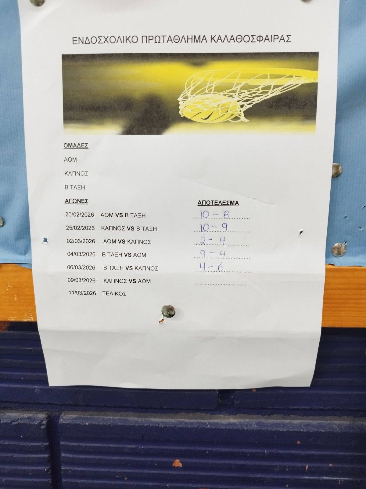 Το ενδοσχολικο πρωτάθλημα καλαθόσφαιρας συνεχίζεται με μεγάλο ενδιαφέρον. Όλοι οι μαθητές περιμένουν τον αγώνα της ερχόμενης Δευτέρας, 09/03 όπου θα προκύψει το ζευγάρι του μεγάλου τελικού!!